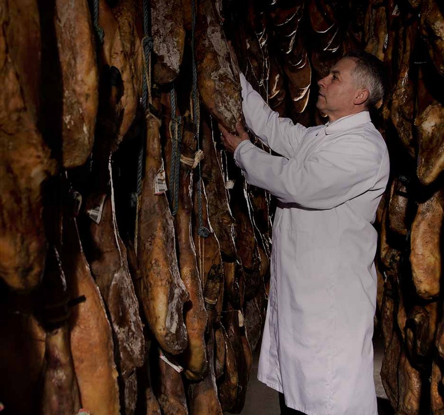 La cuidada elaboración de cada pieza en un entorno único con un microclima privilegiado para la curación, el saber hacer transmitido de generación en generación, el lento reposo en nuestras bodegas y secaderos naturales donde nuestro Maestro Jamonero vigila con total dedicación el proceso de calidad, controlando cada aroma, el punto exacto de sal y la temperatura óptima, hacen de cada pieza una creación única.